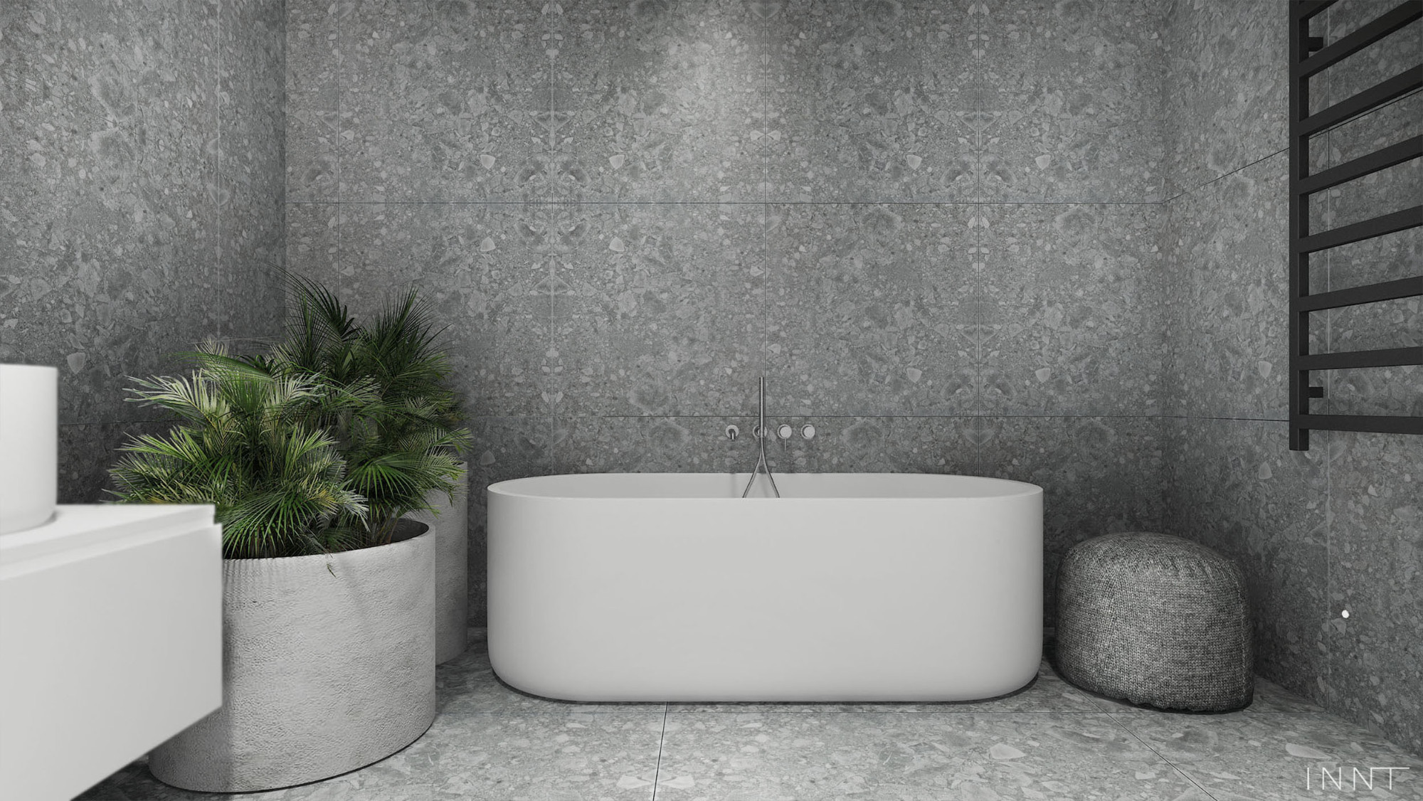 Strefa dzienna stanowi uzupełniająca się wzajemnie całość. Ciemna i chłodna kolorystyka kuchni dopełnia przestrzeń salonu zachowaną w jasnych barwach oraz drewnie. W korytarzu zastosowano duże grafitowe lustro, które nadaje charakteru i stanowi centralny element projektowanej przestrzeni.