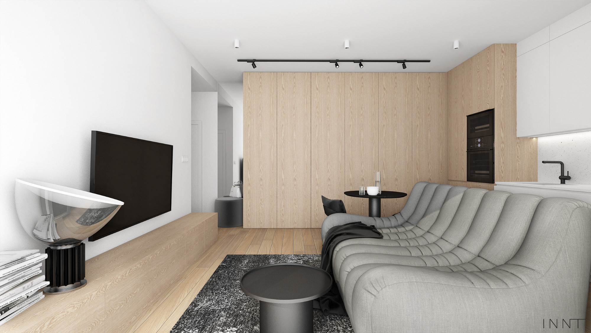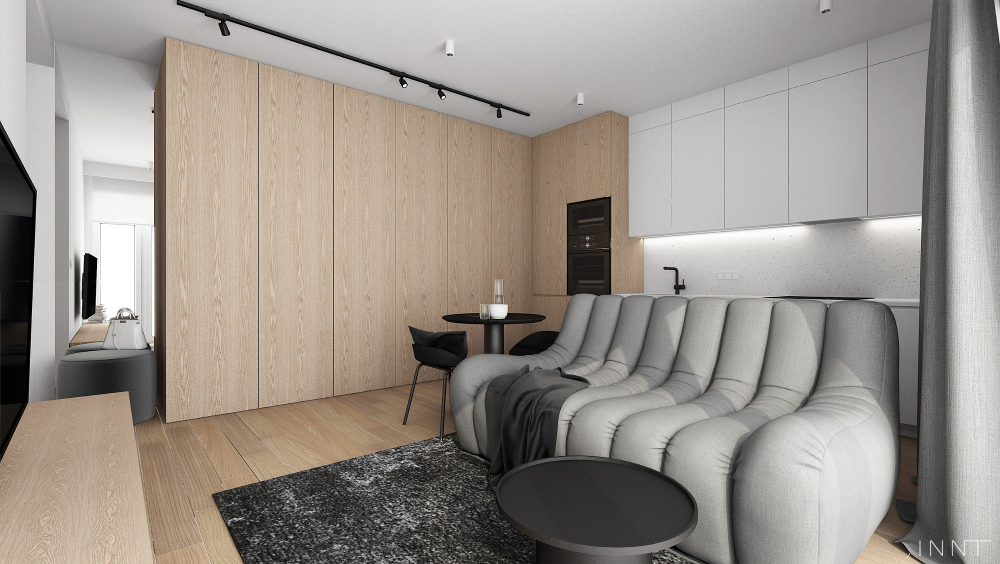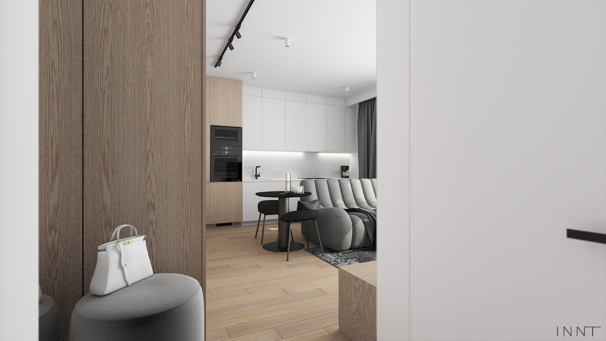 Projekt wnętrz mieszkania obejmujący strefę dzienną oraz łazienkę. Układ funkcjonalny pozwala na odczucie większej przestrzeni, jedynie sofa pełni funkcję przepierzenia pomiędzy kuchnią i salonem. Kolorystyka wnętrza zachowana w odcieniach bieli i szarości. Płaszczyzny z fornirem naturalnym pełnią funkcję garderoby. Łazienka spójnie z pozostałą przestrzenią mieszkania zachowuje założenia kolorystyczne