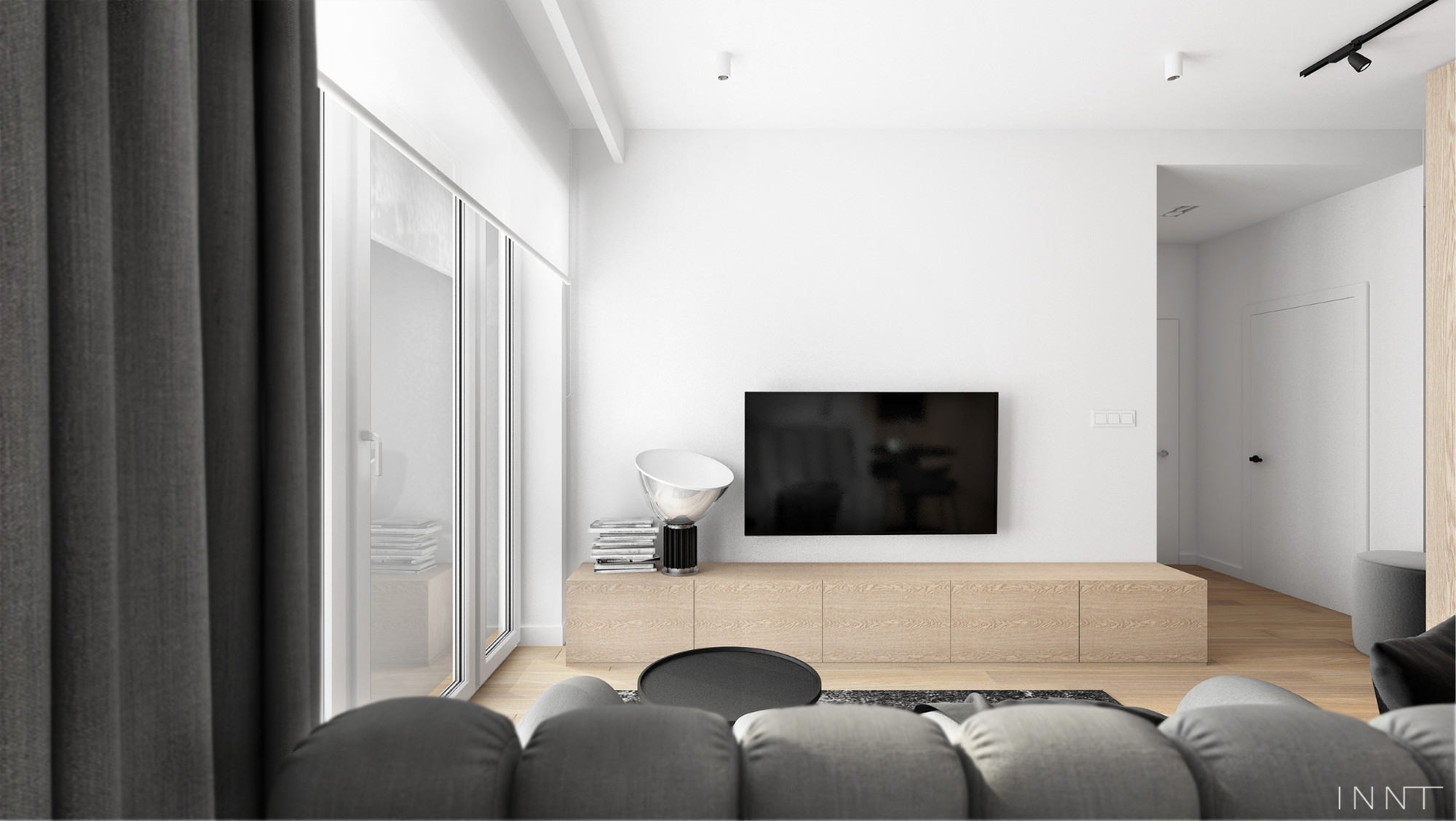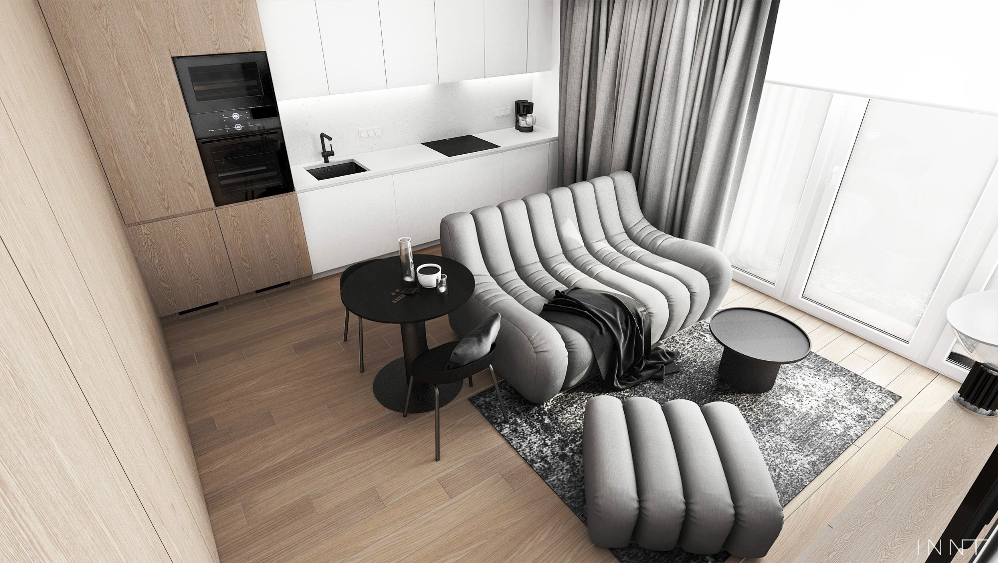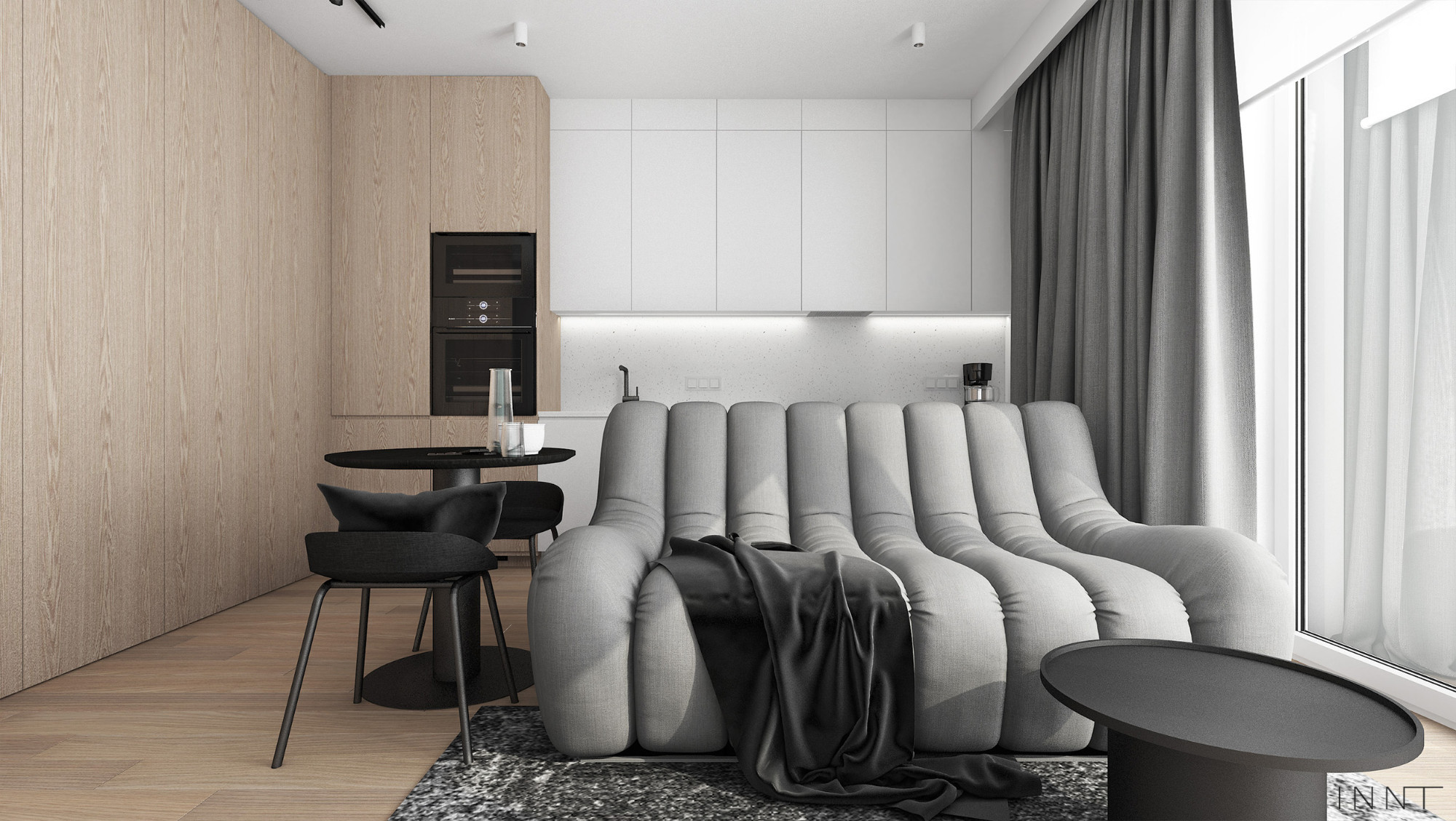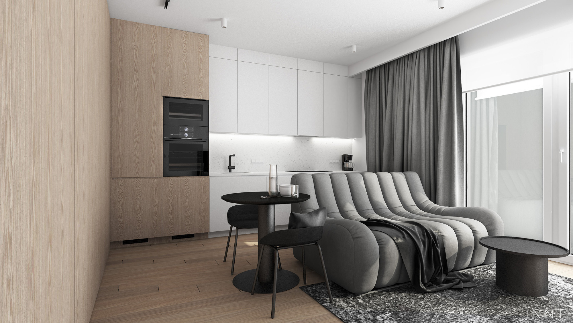Projekt wnętrz mieszkania obejmujący strefę dzienną oraz łazienkę. Układ funkcjonalny pozwala na odczucie większej przestrzeni, jedynie sofa pełni funkcję przepierzenia pomiędzy kuchnią i salonem. Kolorystyka wnętrza zachowana w odcieniach bieli i szarości. Płaszczyzny z fornirem naturalnym pełnią funkcję garderoby. Łazienka spójnie z pozostałą przestrzenią mieszkania zachowuje założenia kolorystyczne