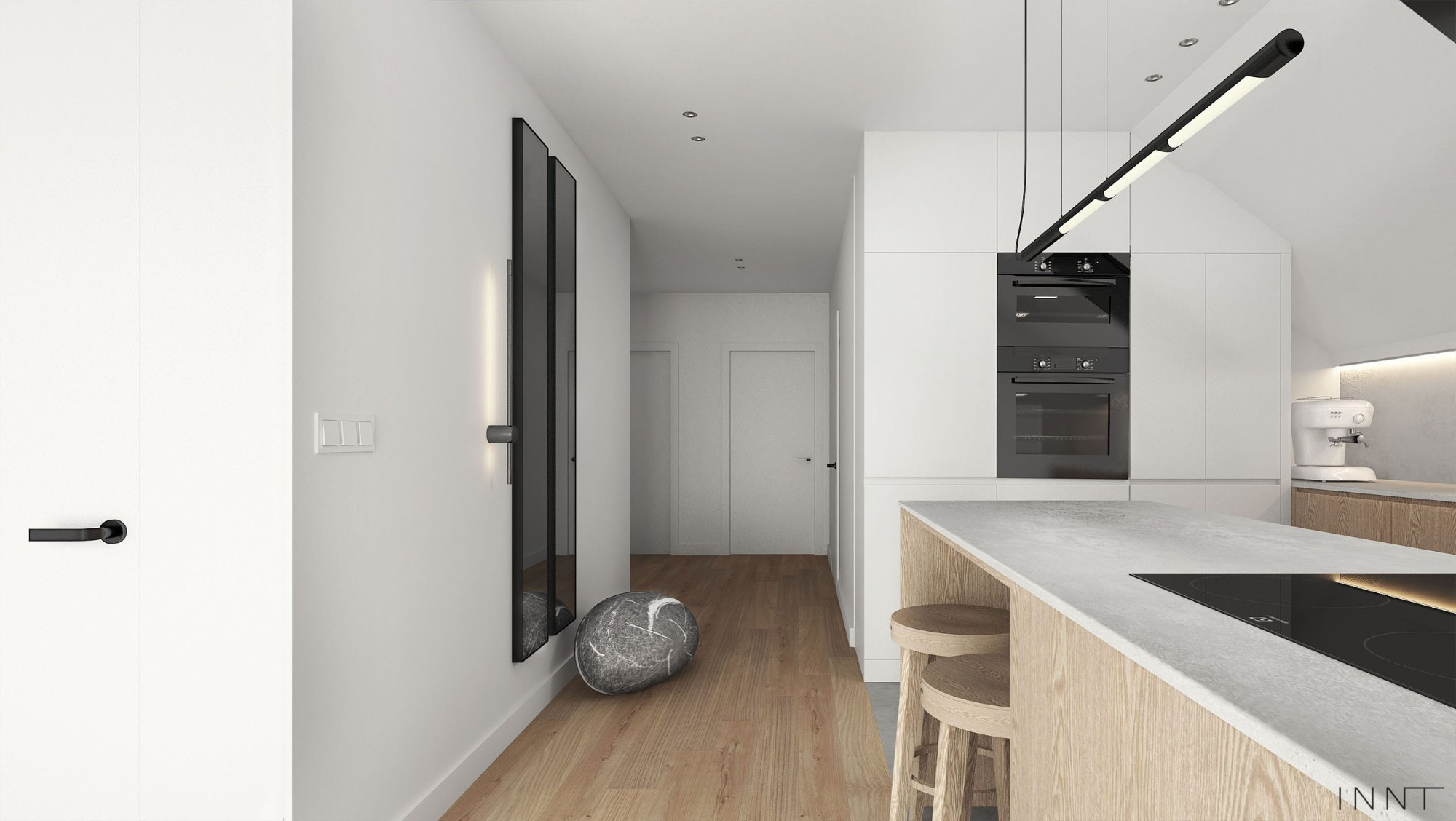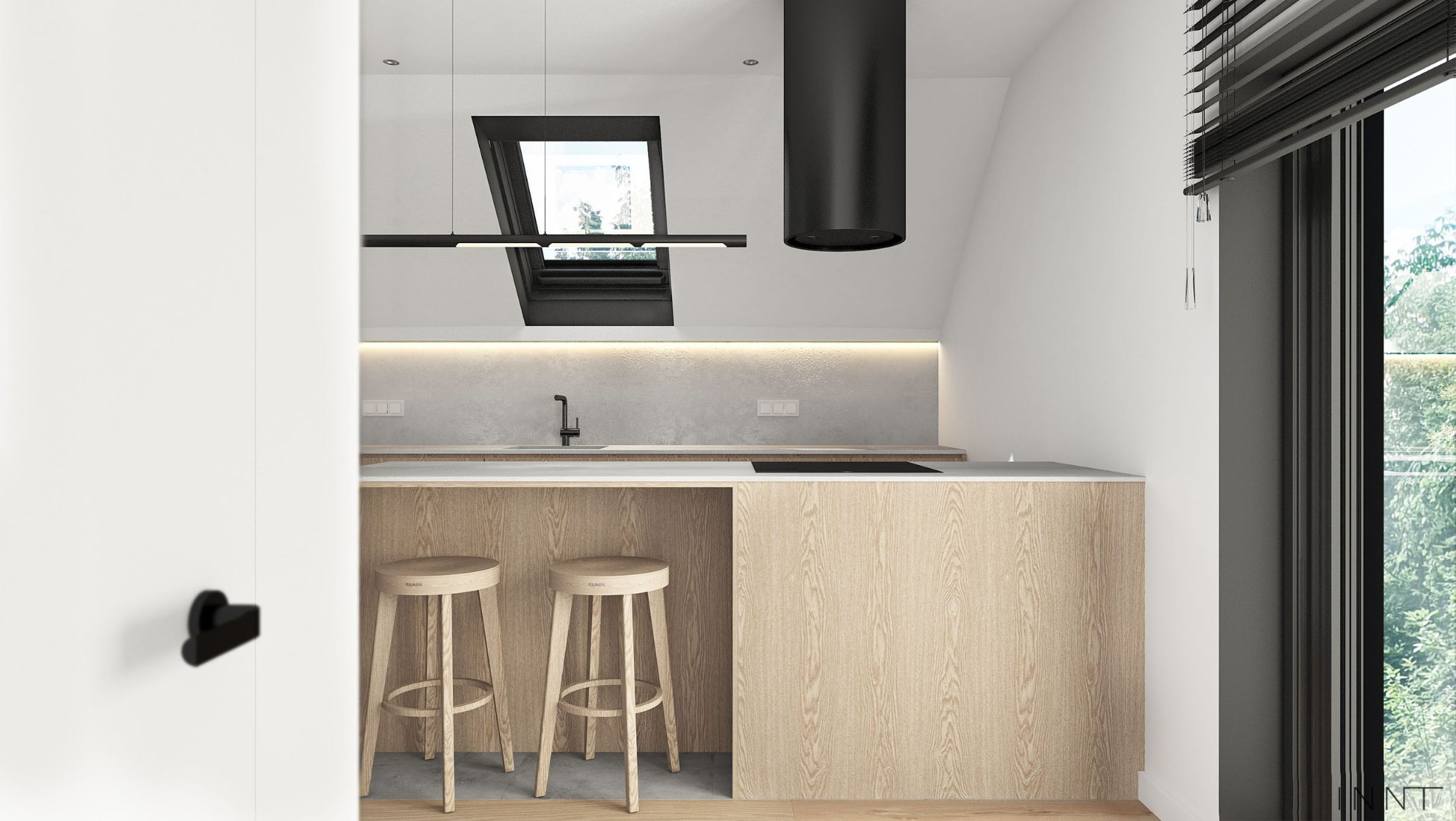 Aranżacja kuchni oraz łazienki na poddaszu domu jednorodzinnego. Kolorystyka wnętrz oparta o odcienie bieli. Czarne akcenty wprowadząją kontrast oraz nadają wyrazistości. Fornir na frontach mebli ociepla cały projekt.