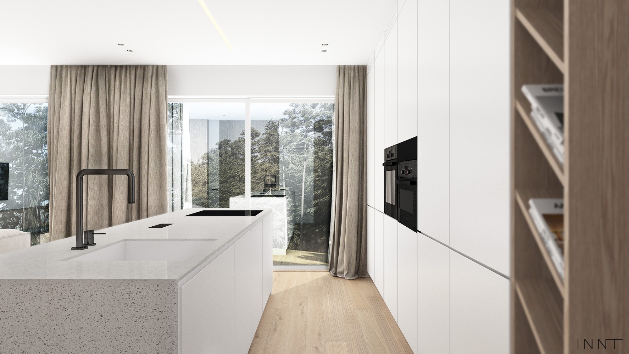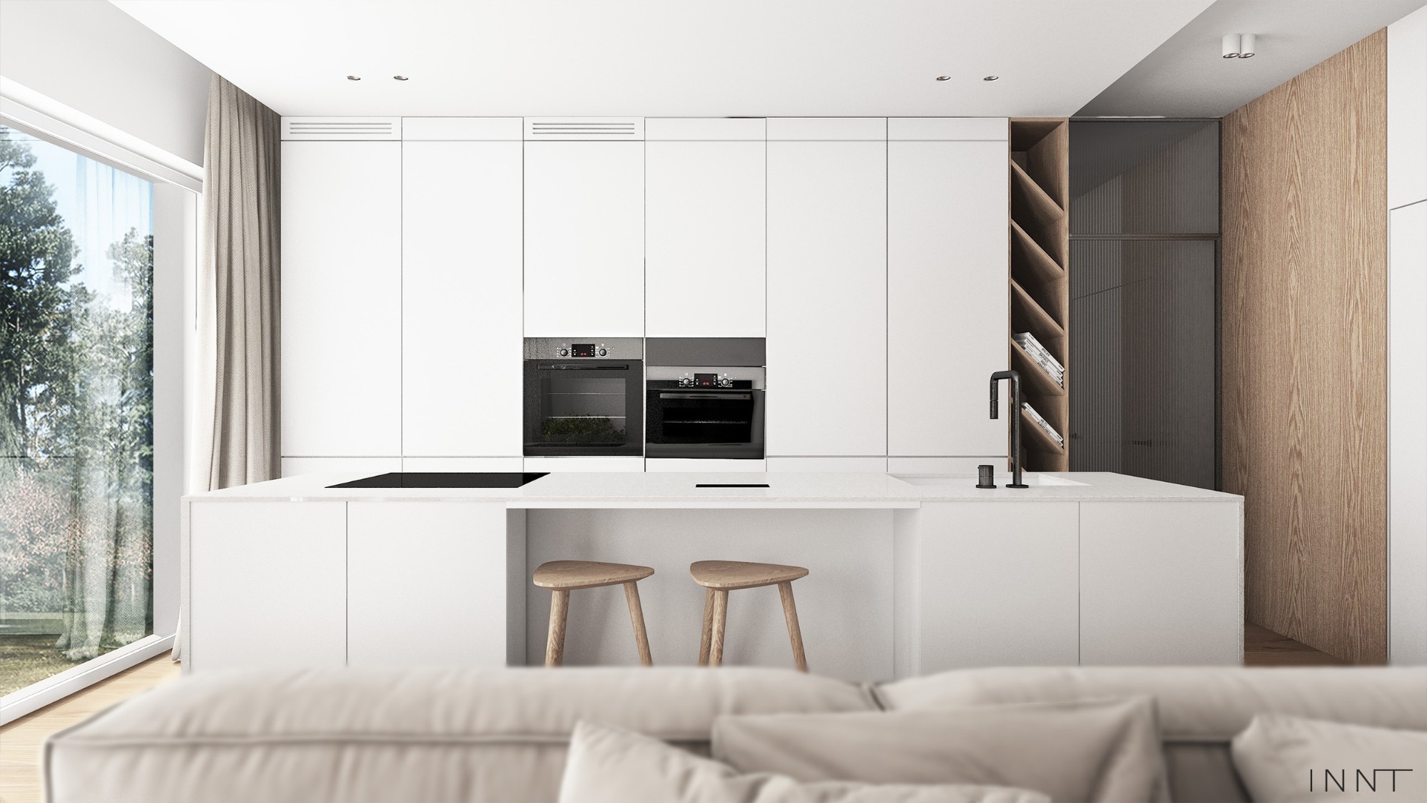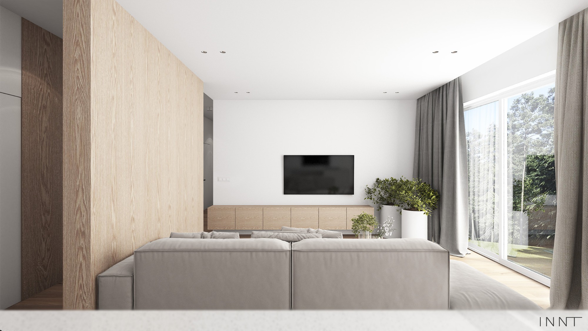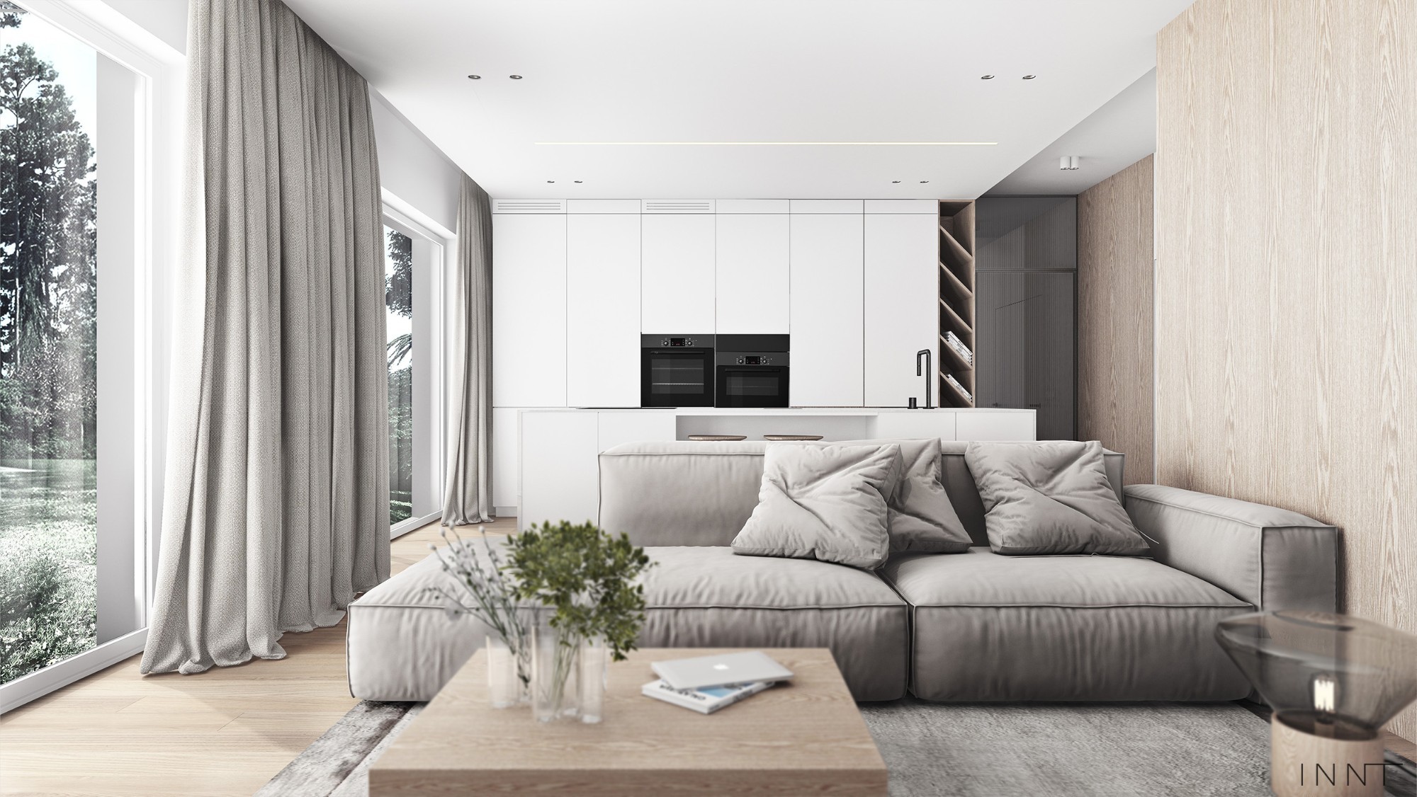 Projekt strefy dziennej mieszkania o łącznej powierzchni 40 mkw. Aranżacja przygotowana według wytycznych klientów ze szczególnym podkresleniem otwartej przestrzeni kuchennej z salonem.