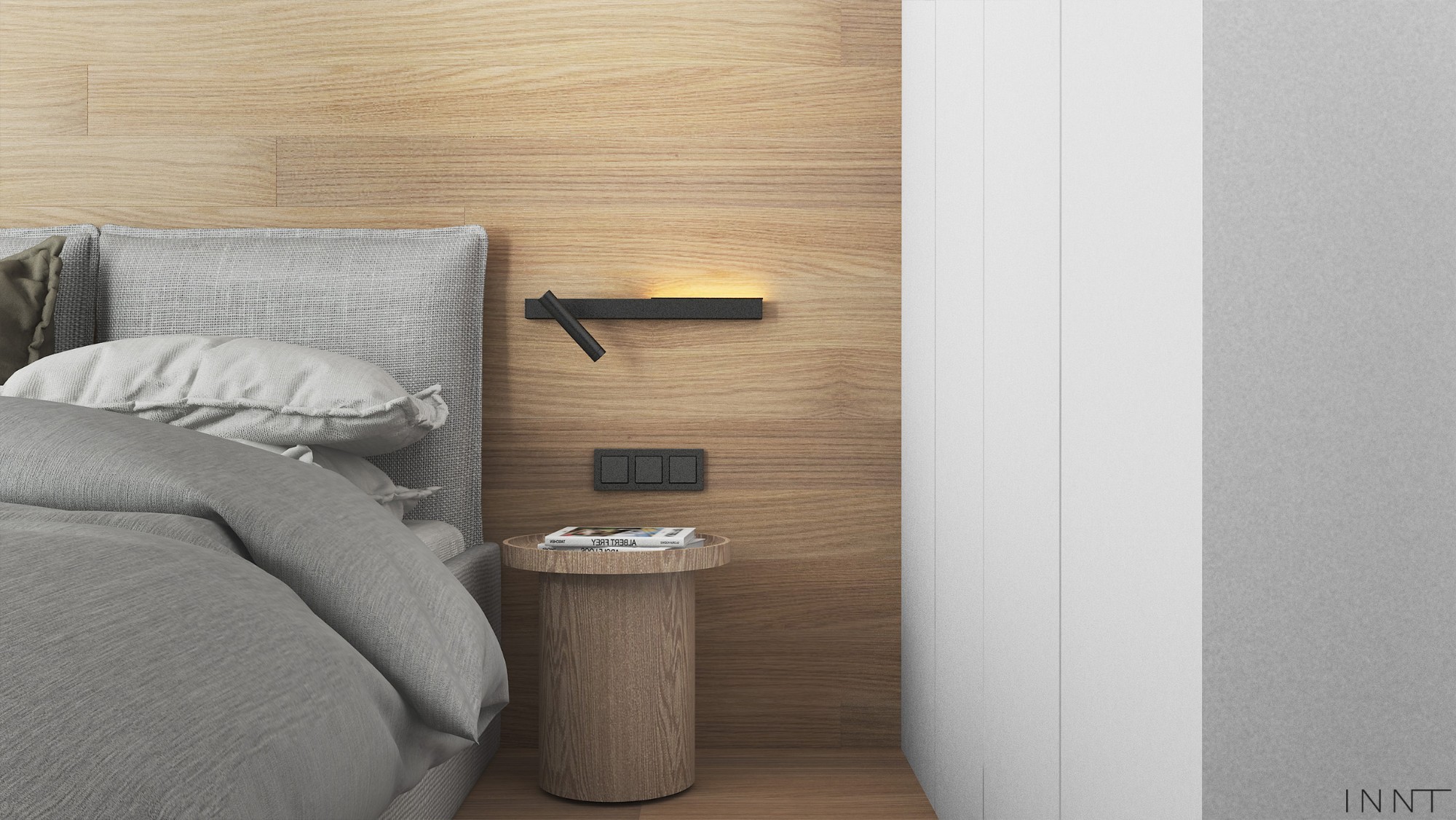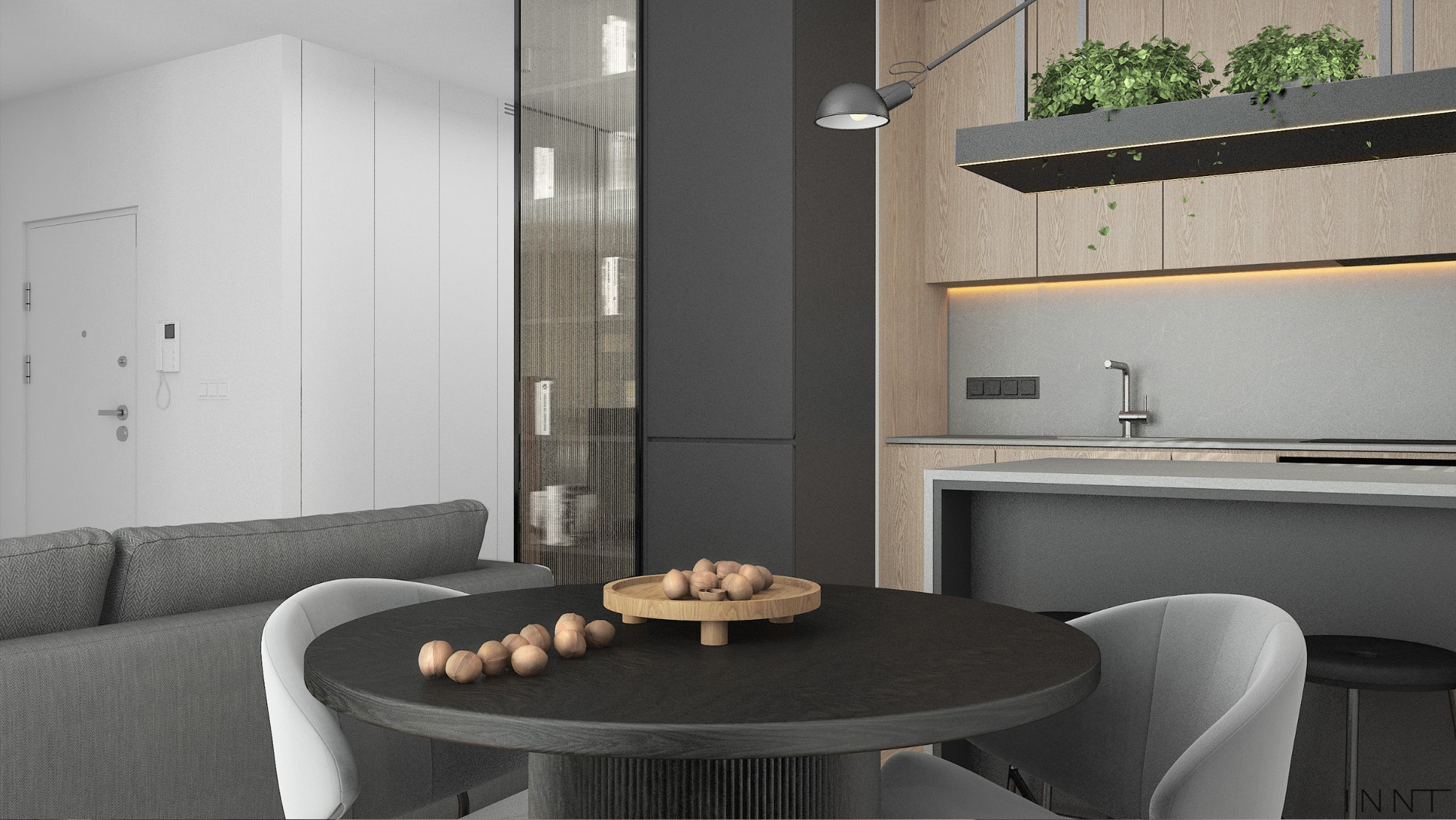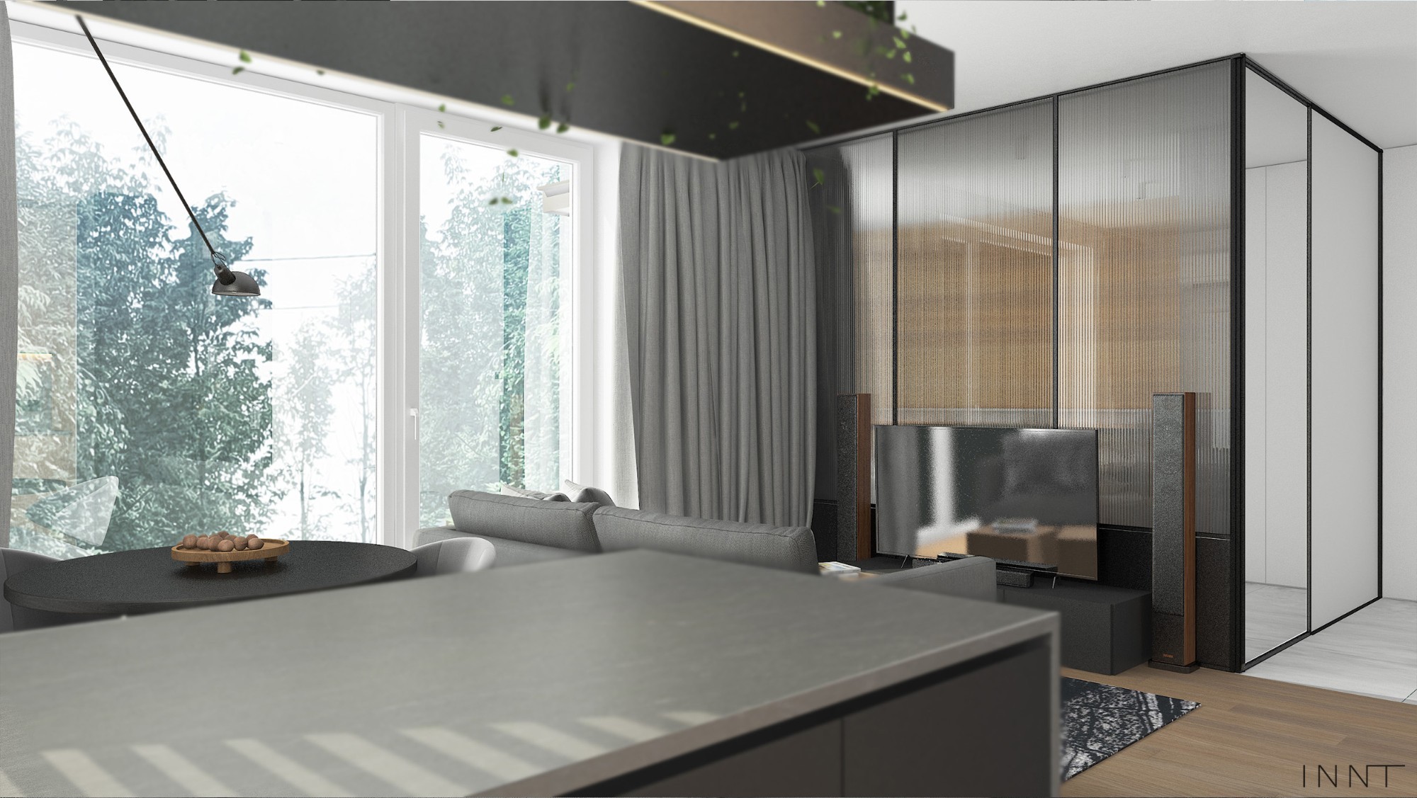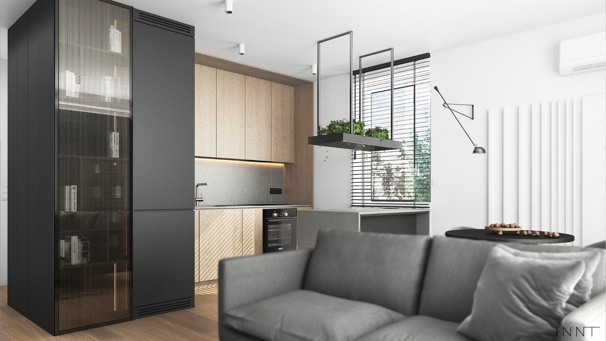 Mieszkanie z połączoną sypialnią z salonem. Konstrukcja stalowa wydziela strefę sypialni i dodaje loftowego charakteru we wnętrzu. Kuchnia z wyspą i stelażem nad blatem to idealne miejsce na małe rośliny. Sypilania jest bardzo minimalistyczna natomiast okładzina podłogi na ścianie to wyjątkowy element. Łazienka z efektowną ramą wbudzi zainteresowanie na pewno wszystkich gości.