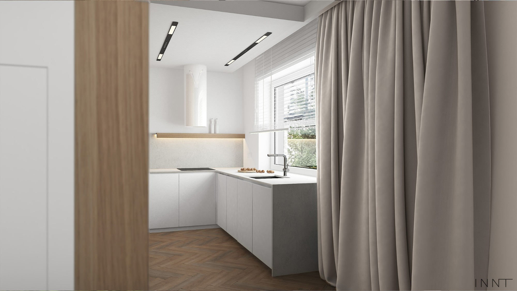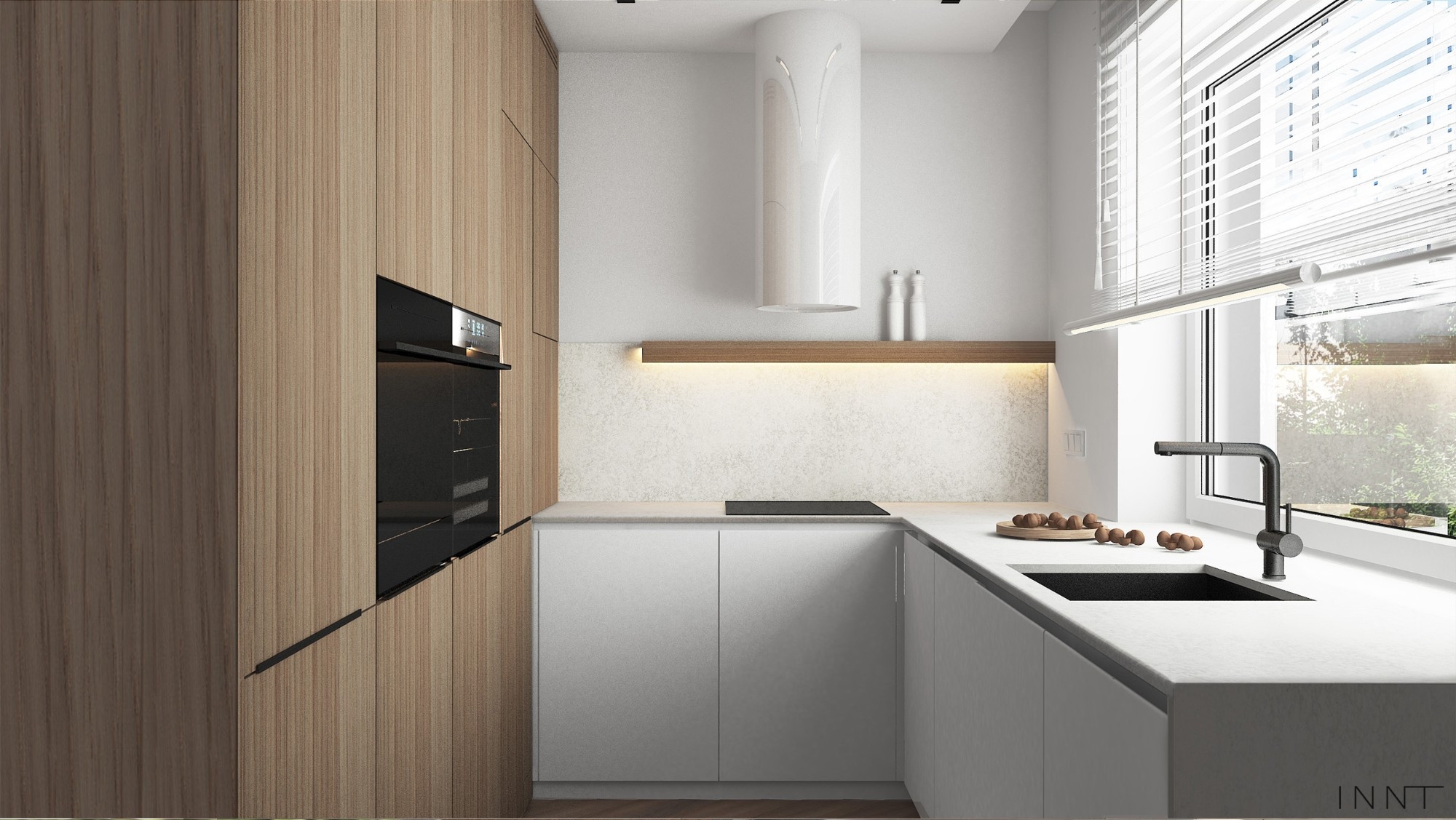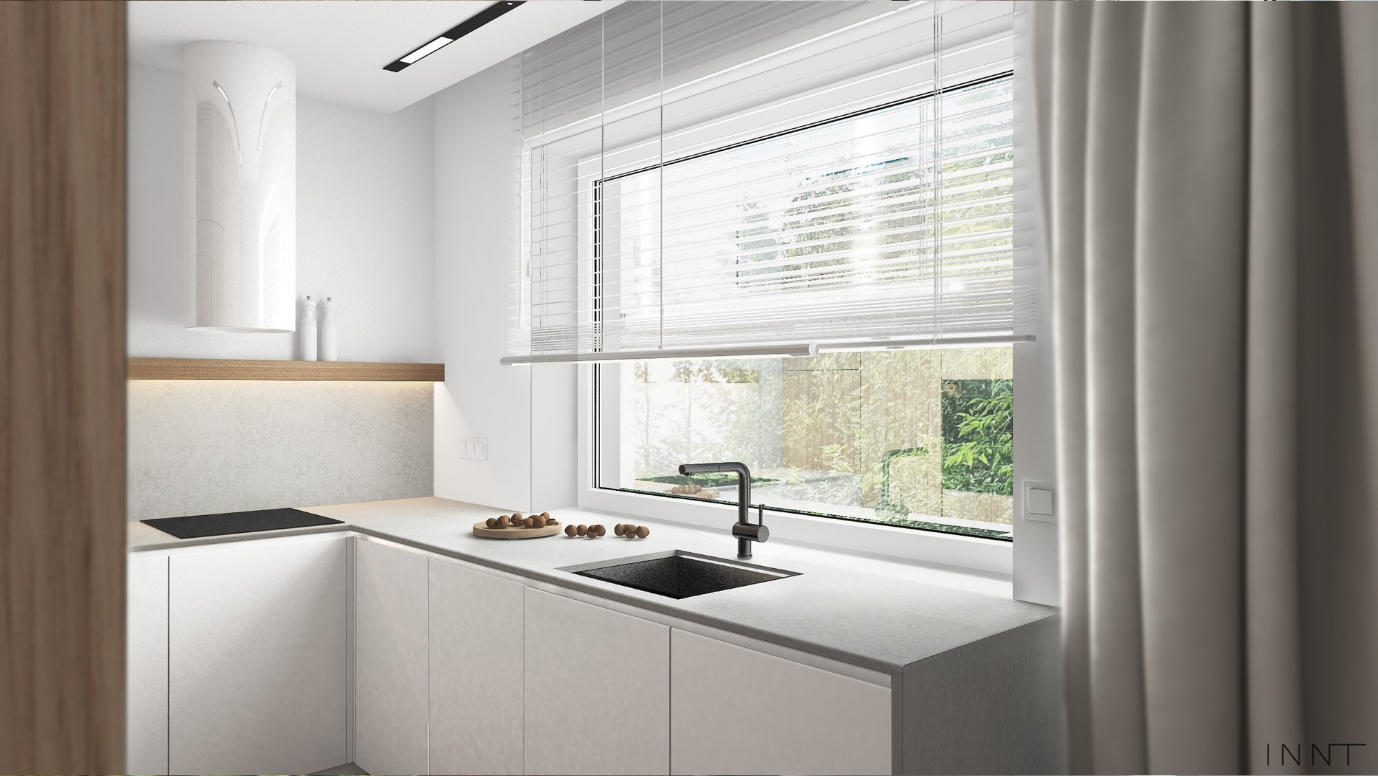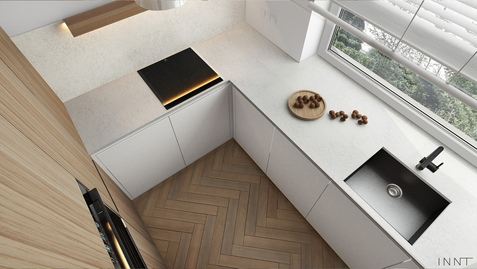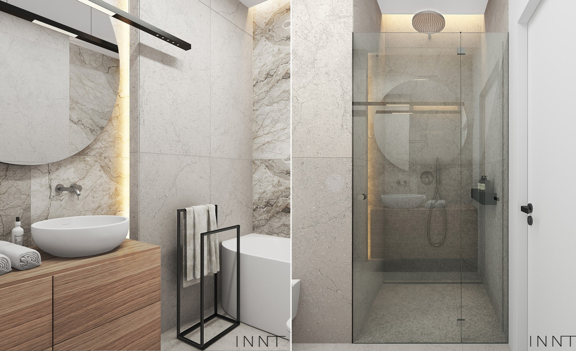 Projekt kuchni i łazienki w domu jednorodzinnym pod Warszawą. Kamienne wzory oraz klimatyczne podświetlenia to mocne strony aranżacji.