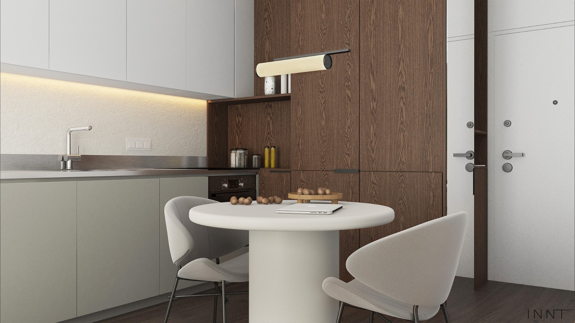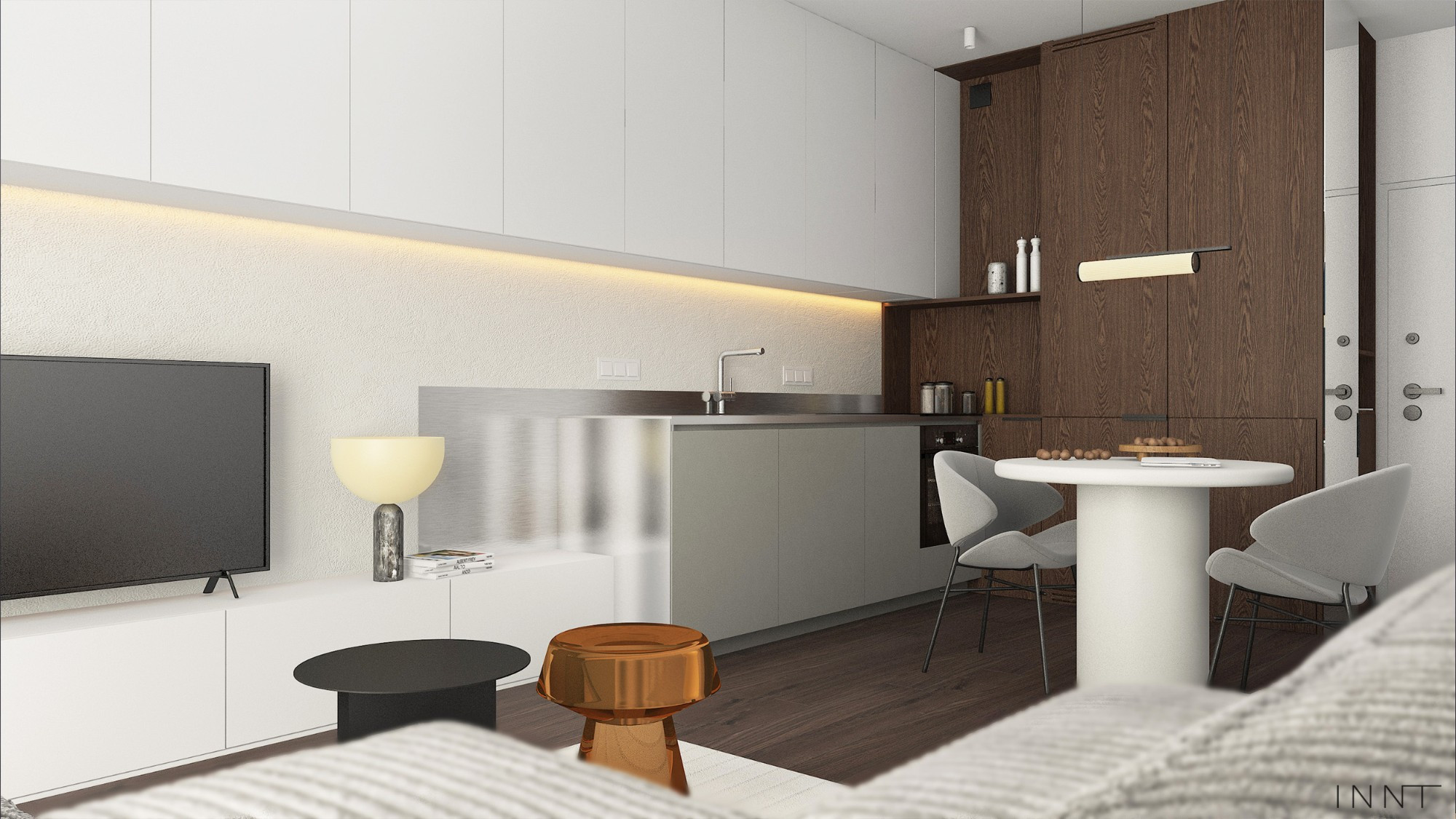 Nieduże mieszkanie z niestandardowymi rozwiązaniami materiałowymi.